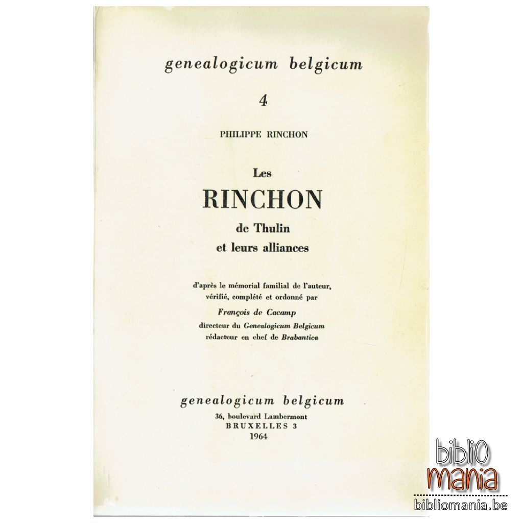 Le petit volume qui relate la généalogie des Rinchon de Thulin et des familles qui leur sont alliées, est sous presse et sera bientôt mis en distribution. Cet ouvrage apportera aux dernières générations de la lignée et des lignées apparentées, un témoignage exact, précis, ordonné et largement développé de ce que l’on sait de leurs ancêtres, dans toute l’étendue de l’éventail d’ascendance.